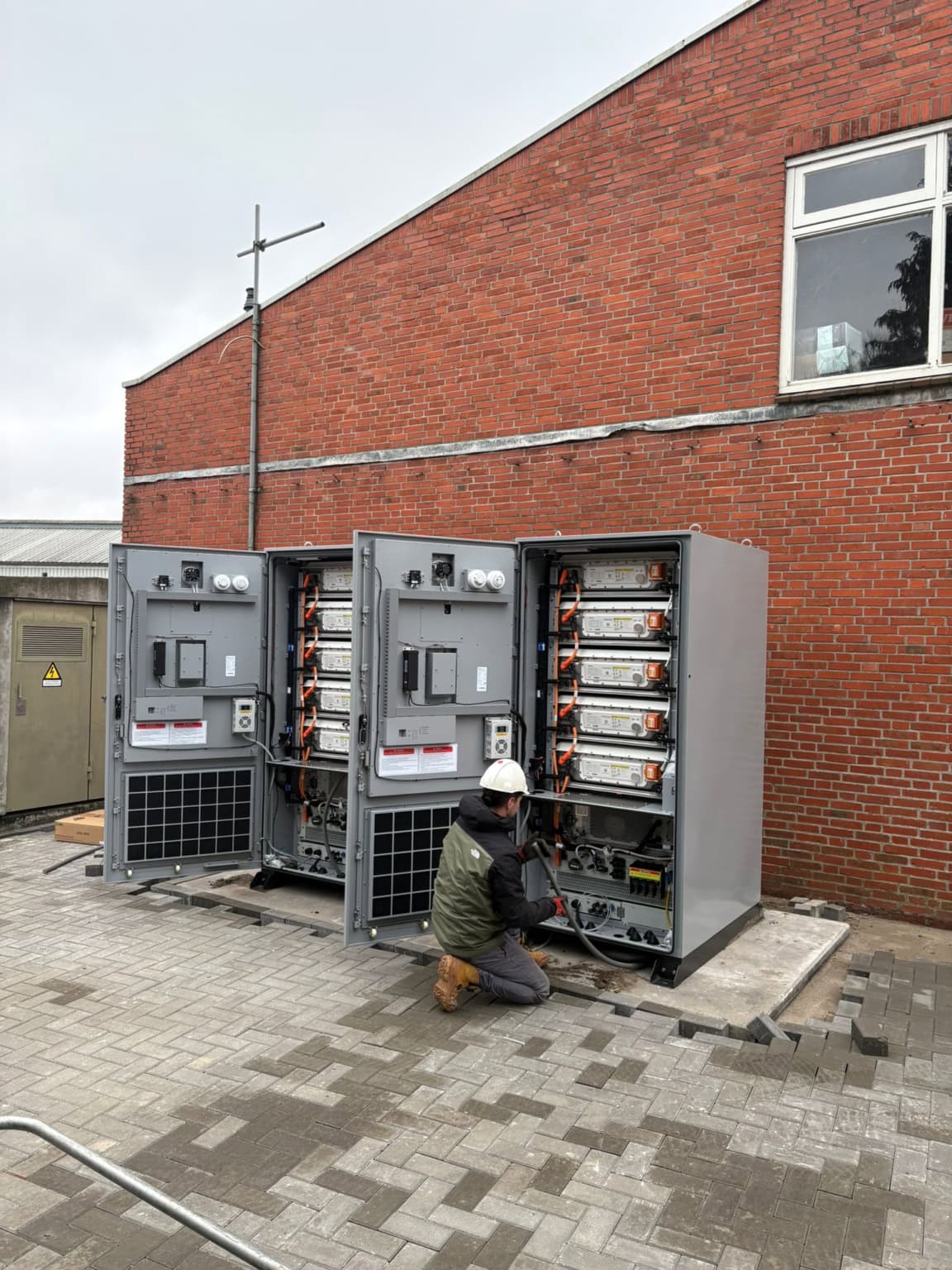 Onze zakelijke batterijen zijn meestal grotere units van ongeveer 1,40 x 1,40 meter en 2 meter hoog. Ze worden doorgaans buiten geplaatst. Kleinere systemen kunnen – indien geschikt – binnen worden geplaatst, bijvoorbeeld bij een groepenkast.